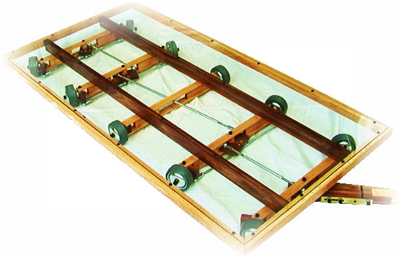 Model for a heavy duty carriage car (scale 1:5): 4-axis steered, weight distribution on 5-axis, lifting capacity 180 kN (18 tons). Real dimensions: 6000x2450x450mm, Towing ring DIN 74054. Point symmetrically rotating steering geometric. Own weight: 1900 kg | |